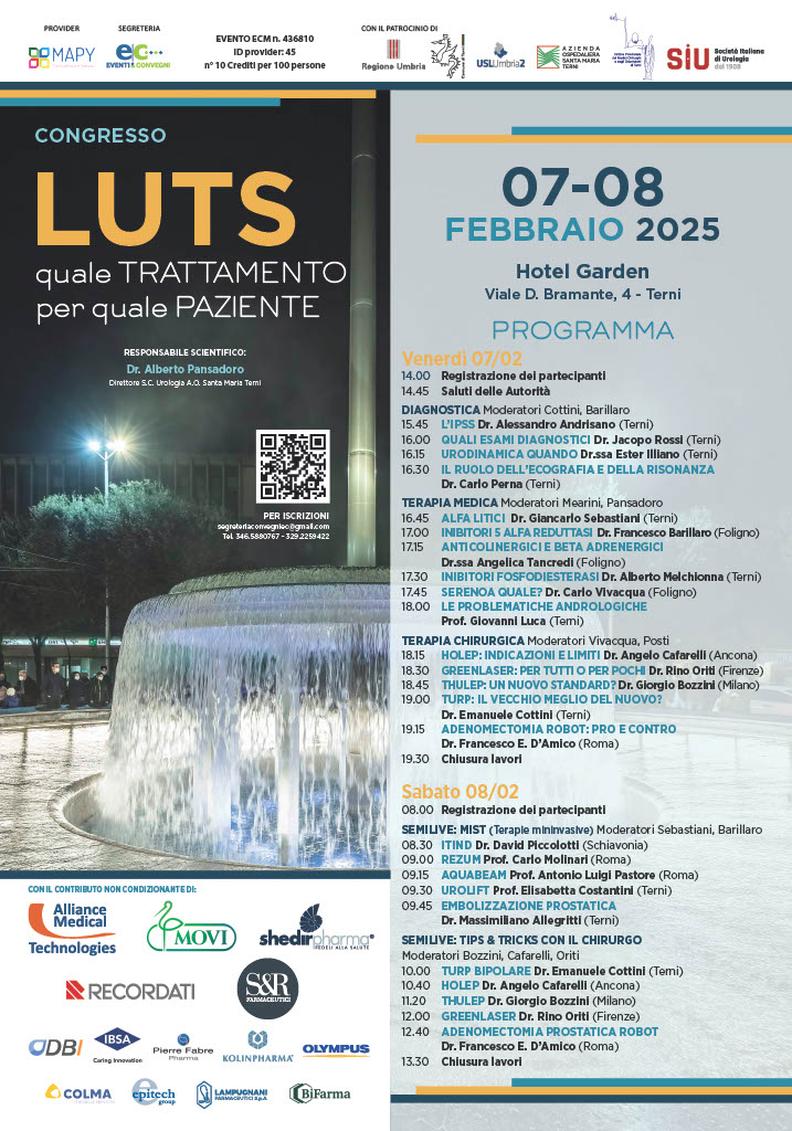 Il 7 febbraio dalle ore 14 alle ore 19.30 e l’8 febbraio dalle 8 alle 13.30 l’Hotel Garden di Terni ospiterà il congresso nazionale dal titolo “LUTS: Quale Trattamento Per Quale Paziente”, organizzato dal Dr. Alberto Pansadoro, Direttore della S.C. Urologia presso l’A.O. Santa Maria di Terni. L’evento, che riunirà i principali esperti urologi italiani, si concentrerà sulle strategie terapeutiche più avanzate per il trattamento dell’ipertrofia prostatica benigna (IPB) e dei LUTS (Lower Urinary Tract Symptoms). “L’obiettivo è quello di fornire ai professionisti del settore una panoramica completa e aggiornata sulle terapie esistenti – spiega il dr. Pansadoro – facilitando la scelta del trattamento più adatto a ciascun paziente in base alle sue esigenze specifiche”.